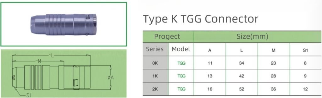 The K-type connector TGG metal straight plug is a straight plug (male) designed for harsh environments, with high strength and a wide range of applications. It supports 2-3 pin core connection, with IP68 high-level waterproof performance and excellent anti-electromagnetic interference capability. It has a compact structure and is easy to install. It is equipped with positioning pins and cable clamps to ensure a stable and reliable connection. It is suitable for high-precision and high-strength scenarios in the fields of industrial automation, outdoor equipment, medical equipment, etc.