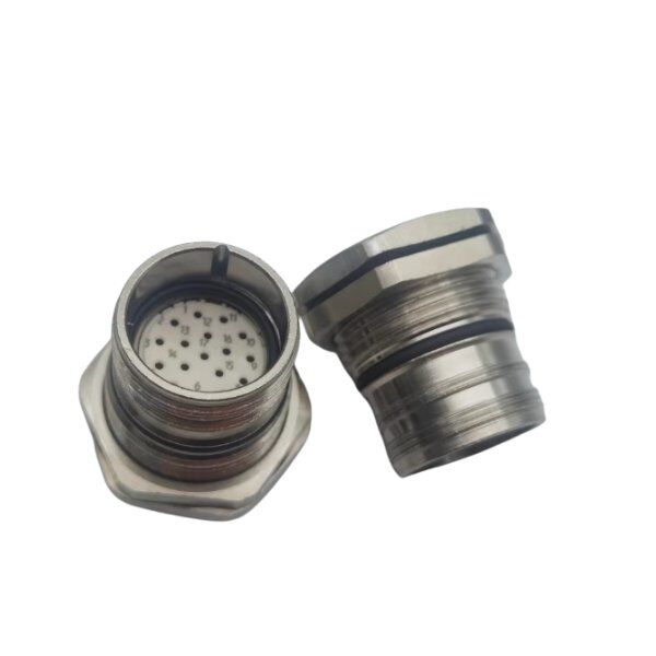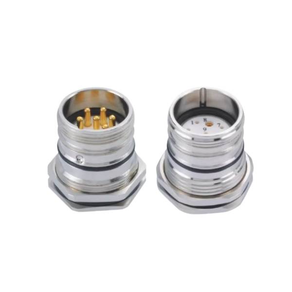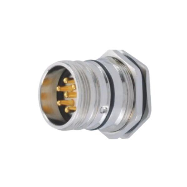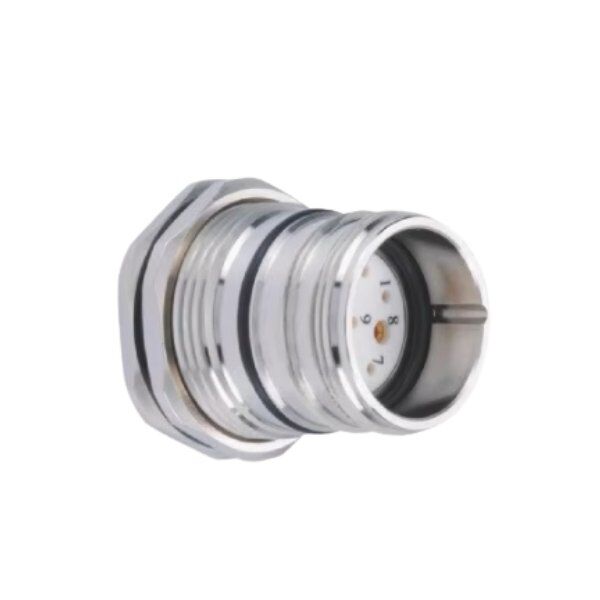 M23 rear lock panel circular connector, with standard M23 interface, brass nickel-plated process, with excellent corrosion resistance. The nut fixing design on the rear side of the panel is convenient and stable to install, with waterproof and dustproof characteristics, suitable for scenes such as industrial automation and equipment connection, and provides reliable guarantee for cable transmission.