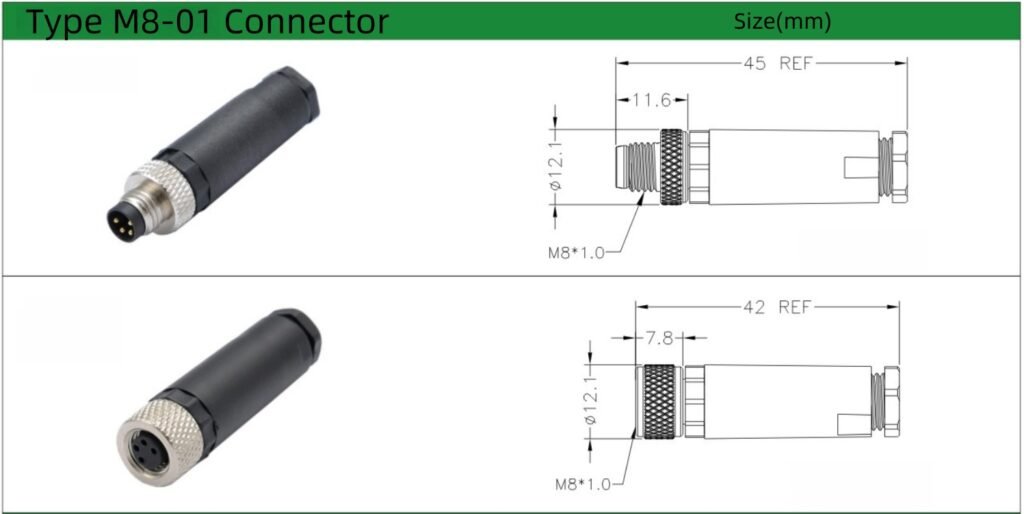 The M8 connector is designed with “stable connection + durable protection” as the core concept:Locking mechanism: assembled locking screw structure, which can effectively resist vibration and pulling after tightening to avoid poor contact;Material advantages: The shell is made of high-strength engineering plastic, which is insulated and moisture-proof, light and easy to install; the internal brass nickel-plated connector has excellent conductivity, strong corrosion resistance and extended service life;Flexible adaptation: supports 3-pin/4-pin (type A) pin number selection, and the pinhole arrangement is clear to meet different signal transmission requirements.